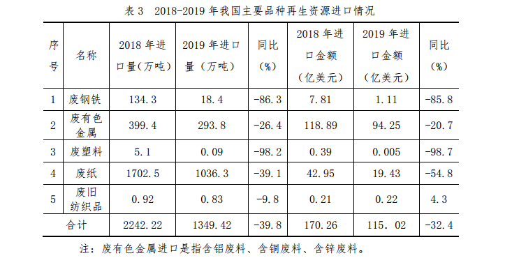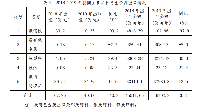 2019 年,我国废钢铁、废有色金属、废塑料、废纸、废旧纺织品五大品种再生资源出口量 40.66 万吨,同比下降 40.2%。2018-2019年我国主要品种再生资源出口情况如表4 所示。