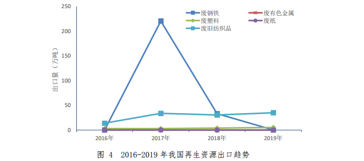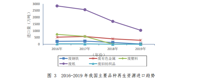 2019 年,我国废钢铁、废有色金属、废塑料、废纸、废旧纺织品五大品种再生资源进口量为 1349.42 万吨,同比下降 39.8%。其中降幅最大的是废塑料,同比下降98.2%。2018-2019年我国主要品种再生资源进口情况如表3所示。2016-2019 年我国再生资源进口趋势如图 3 所示。