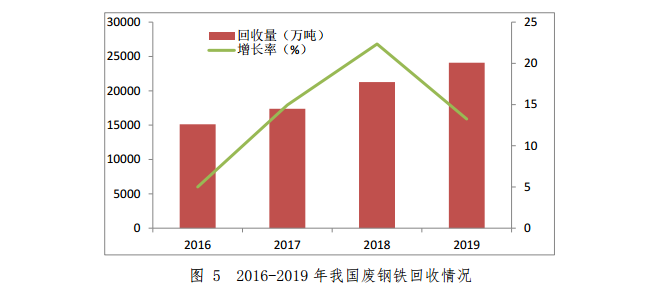 2019年,我国粗钢和钢材产量分别为9.96亿吨和12.05亿吨,同比增长8.3%和9.8%,粗钢产量再创历史新高;回收废钢铁约24097万吨1,同比增长13.3%。其中,重点大型钢铁企业回收废钢铁约21597万吨,同比增长15.0%;其他企业回收废钢铁约2500万吨,与2018年持平;废钢单耗为216.7kg/t 钢,同比增加14.4kg/t钢,增幅为7.1%,综合废钢比21.67%, 同比增加1.49个百分点。2016-2019年我国废钢铁回收情况如图5所示。