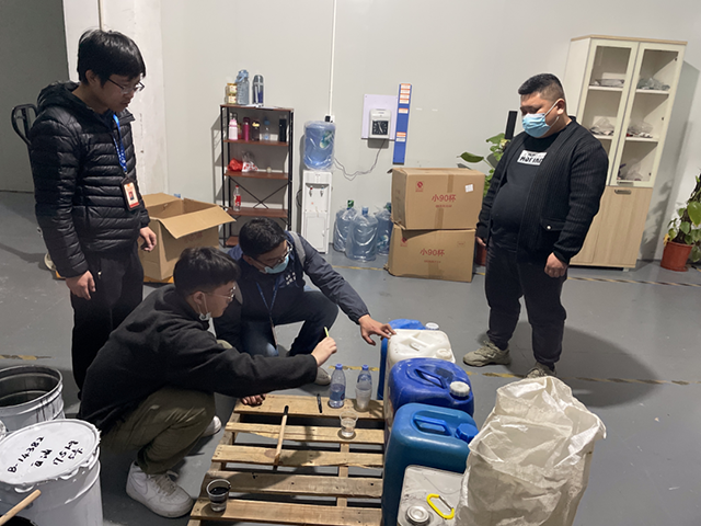执法人 员检查油漆桶和 废油漆渣等危险废物倾倒现场