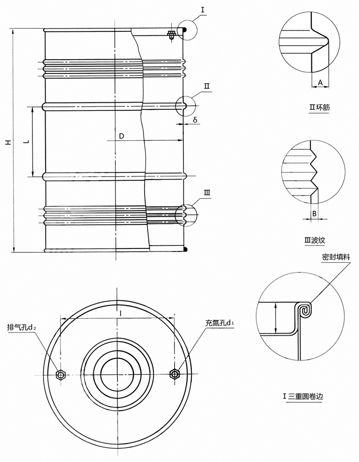 3.1.6 装料口两侧对称设置充氮孔和排气孔各一个,两孔采用标准螺母以压合形式与桶顶锁紧。桶顶装配结构参见附录A。