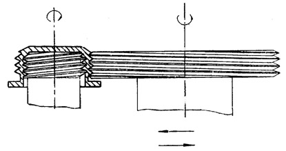 (2)滚丝的原理。桶塞采用螺旋模横轧法,其原理是两滚轮轴线与工件轴线平行,或一滚轮(刀)与工件轴线同轴,滚轮(刀)螺旋角与工件螺旋角相同,而大滚轮(刀)螺旋方向与工件相反,小滚轮(刀)螺旋方向与工件螺旋方向相同,大滚轮(刀)作横向进给,工件无轴向移动。其原理图见图8-20。