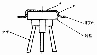 图14-14为桶顶底的内喷涂架,桶顶底置于架上,并由中间轴带动水平旋转,然后喷枪从上部喷向桶顶底表面,一般来说这可以在喷漆室里进行,大批量生产时还应有输送桶顶底装置,喷枪可设置为固定式,自动喷涂。小批量生产时,可手工喷涂。