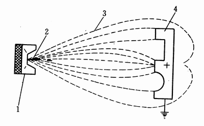 1—静电喷枪;2—电力线; 3—负高压电极;4—被涂工件
