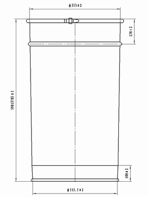 目前柱锥形钢桶主要有200升、215升和230升三种,属于开口桶,此桶采用0.8mm厚的冷轧薄钢板为原料,桶体为锥形,桶身上端内径为553mm,下端内径为516mm,桶高分别为940mm(200L)、970mm(215L)、990mm(230L)。桶身、桶底卷封采用二重平卷边。桶上盖为全开口型式,用环箍式封闭器封闭,钢桶内外涂装。在离桶口上端90毫米的桶身上有一环箍,下端离桶底100毫米的桶身锥度增大,便于空桶装码运输。桶底有四道环形筋和六道径向筋,并有24个4mm的圆孔,有利于装货时内衬袋与桶壁间的排气。此产品为单一品种,各项性能指标均按有关标准生产,并符合用户的要求。该产品适用于盛装食品果酱、番茄酱及固态和半固态化工产品等,使用时,一般在桶内衬有无菌塑料袋。结构尺寸如图2-9所示。