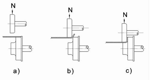 如图9-5所示为滚压翻边过程。a)是成型前桶身毛坯置于下辊轮第一个台阶上进行定位,为了使桶身不至于左右窜动而影响翻边精度,左右两下辊均有一限位台阶,使桶身正好夹于辊内。b)为工作阶段,上辊下压,与桶身接触,桶身即随上下辊一同旋转,在上辊下压进给的过程中,桶身随上辊同时下降,桶边在上下辊的间隙中向外翻转。c)滚压结束成形阶段,随着上辊的不断下降,桶身被压下到最低的辊轮台阶上,翻边基本成形完毕,翻边结束时,上辊升起。