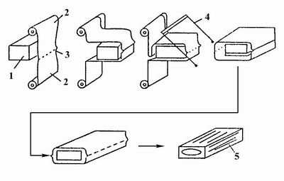用单卷平膜可采用枕形袋式。这种方式是用单卷平膜,先封纵缝形成筒状,将产品裹于其中,然后封横缝并切断制成枕型包装。其原理与制袋充填包装相似,操作过程见图2-11-5。