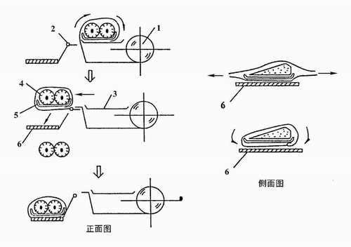 1—薄膜卷筒;2—电热丝;3—工作台;4—产品;5—浅盘;6—热封板