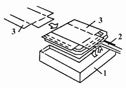 c.平板涂胶法。见图2-12-3,加热熔化的胶液盛于贮胶盘1中,被涂敷件3(如纸盒坯)的涂敷表面向下放置于涂胶平板2上,涂胶平板上下运动,下降时携带纸盒坯在贮胶盘内涂胶,上升后即完成涂胶。其余过程同前。涂胶平板上按照被涂敷件需要涂胶的部分刻出空槽。这样可以一次涂敷全部要涂胶的表面,从而提高效率。这种方法多用于纸盒的粘合。