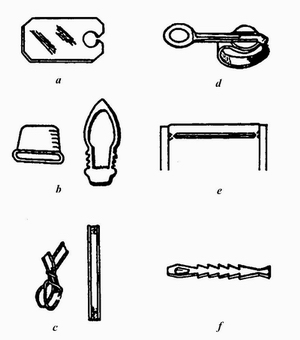 这类封闭物主要是夹子、带提环的套、按钮带、扭结带和扣紧条等。图2-12-10中所示的6种都是使用方便的塑料袋封闭物。(a)图为塑料夹子,用于袋装烘烤食品;(b)图为带提环的套,包括一个提环和一个套,提环下部两侧可以调节松紧;(c)图为扭结带,很像电视天线的扁馈线,由两条铝丝外面包以软塑料,扭结后不会松开,用于面包、糖果等小袋商品;(d)图为按钮带,将袋口捆扎后靠按钮固定,使用方便;(e)图为条形拉锁边,是在塑料袋口一面制出一条扁条,另一面制出一条扁槽,封闭时,只需将塑料袋两面重合,用手压紧一侧,让条与槽囫事,然后沿拉锁边滑过去就可以锁紧,可以重复使用,用于纺织品、小五金零件、礼品、化妆品和旅游用品等的包装袋;(f)图是塑料扣紧条,作用与带提环的套相似,但更简单。