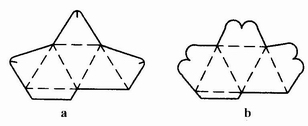 根据其折向有内折叠盘式纸盒和外折叠盘式纸盒,即纸盒左右的侧板折向盒内时,其前后侧板向外翻折时为外折叠盘式纸盒;而当纸盒的左右侧板折向盒内时,前后侧板也折向盒内的为内折叠纸盒,见图4-3-49。
