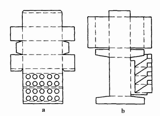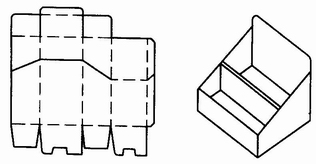 (2)展销台。图4-3-58a是将盒盖折回作为展销台,使盒面倾斜,以利于展示;图4-3-58b则是另用一块纸板设计成展销台。