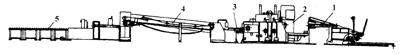1—自动喂料机;2—印刷切角开槽机;3—碎边移送装置;4—自动胶粘机;5—输出液道