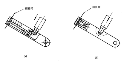该机构主要是使退带后的捆扎带再一次拉紧。当捆扎带缠上被捆包件以后,液压马达4停转,油液进入差动油缸8,推动活塞杆外伸,使张紧臂3下摆拉紧捆扎带,见图6-8-14。为了使捆扎带能随张紧臂3下摆而拉紧,还必须依靠张紧臂头部的轧头。图6-8-15所示的是二种不同的夹紧方式,其中图a是利用杠杆原理,使捆扎带在随差动油缸8的活塞杆外伸时推动夹头夹紧捆扎带,而图b则是利用油缸夹紧。
