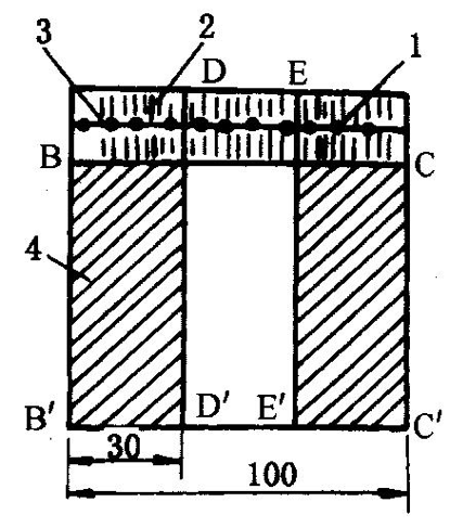 (2)将此试样如图7-2-15所示,沿着与缝合线垂直的BB′/CC′线切取宽100mm的试片。