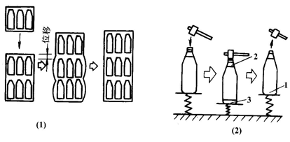 如图7-2-36(1)所示,装有玻璃容器的纸箱跌落在堆码的瓦楞纸箱上时,所产生的碰撞使下层纸箱内的玻璃容器突然下移,虽然位移很小,但由于容器的内容物悬空,致使容器与内容物之间产生空穴,容器内的上部同时受到压缩,这一压缩力又传递给内容物,并通过它冲击整个容器,在容器底部区域形成高压。水冲现象的模拟可参见图7-2-36(2)。