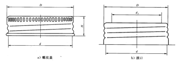 ● 旋盖型封闭器的结构和尺寸。旋盖型封闭器由螺纹盖、颈口和塑料或橡胶内垫组成,常用于小容量钢桶的密封。其结构见图1-20所示,尺寸见表1-23所示。